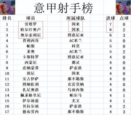 射手榜方面,劳塔罗今天又破门,2轮打入3球的他7球又一次独居榜首。恰尔汗奥卢今天也进球了,他追上奥尔索利尼,两人6球并列第2。普利西奇,帕斯,莱奥5球并列第4,邦尼,伊尔迪兹,卡斯特罗等人则是4球刚好挤入前十。