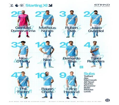 北京时间12月14日22:00,英超第16轮,曼城客战水晶宫。蓝月公布先发,哈兰德单箭头,多库意外落选,瓜迪奥拉解释,比利时右边锋伤到大腿,被迫缺席此役。 曼城首发(4231):唐纳鲁马/努内斯、鲁本·迪亚斯、格瓦迪奥尔、奥赖利/贝尔纳多·席尔瓦、尼古拉斯·冈萨雷斯、赖因德斯/谢尔基、福登/哈兰德 替补:特拉福德、阿克、马尔穆什、艾特-努里、萨维尼奥、胡桑诺夫、奥斯卡·鲍勃、穆卡萨、里科·刘易斯